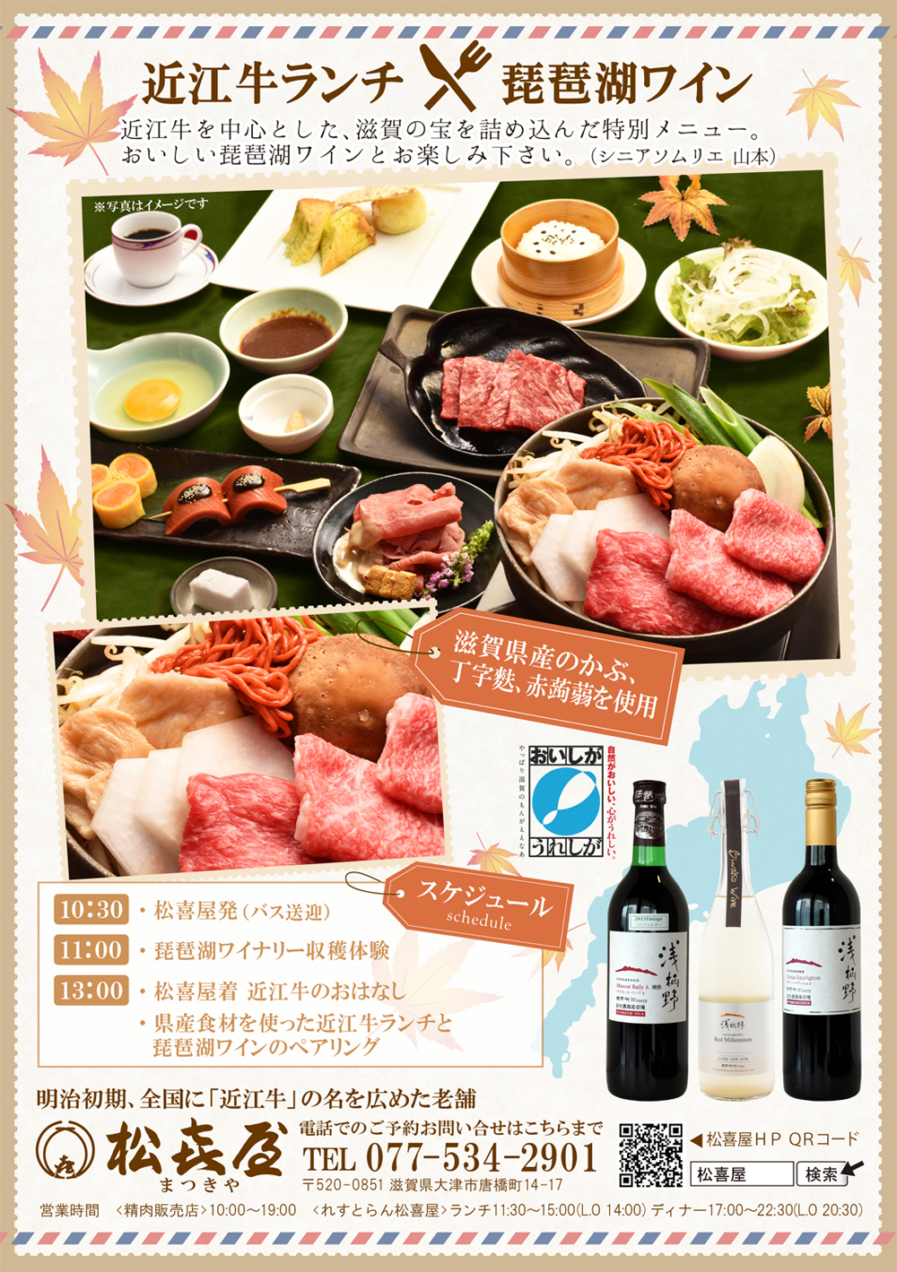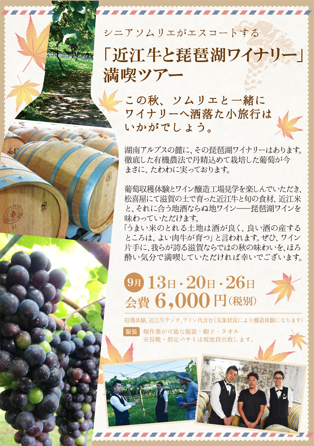 9月13日・20日・26日の3日間、「近江牛と琵琶湖ワイナリー」満喫ツアーを開催致します。