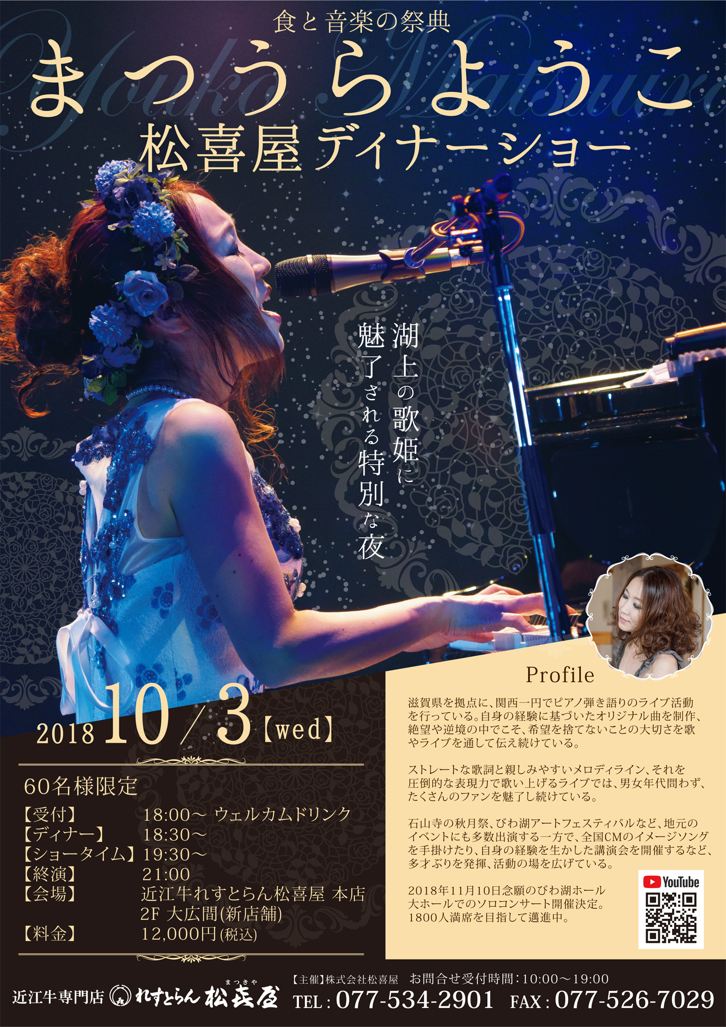 当店二階の大広間にて、滋賀県を拠点に、関西一円でピアノ弾き語りのライブ活動を行うシンガーソングライター「まつうらようこ」様をお迎えしてのディナーショーを行います。