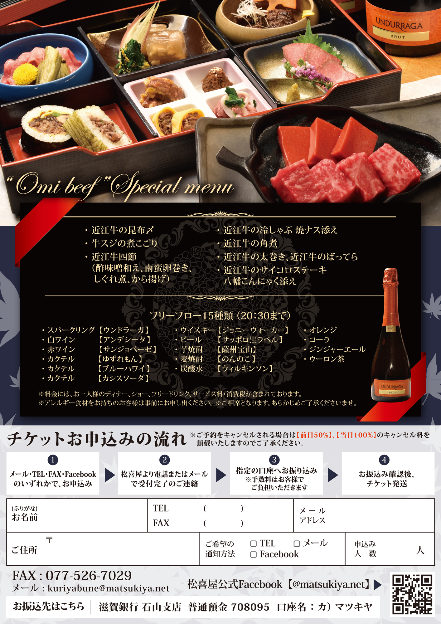 ピアノと歌による美しい旋律とお楽しみいただくのは、松喜屋シェフが腕を振るう渾身の近江牛スペシャルディナー。加えて15種のドリンクはフリーフローとさせていただきます。