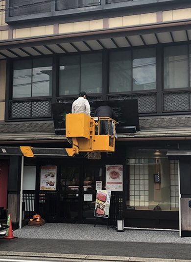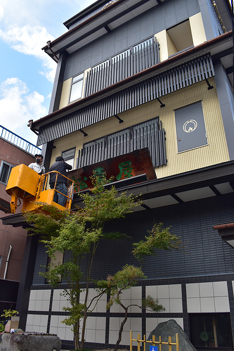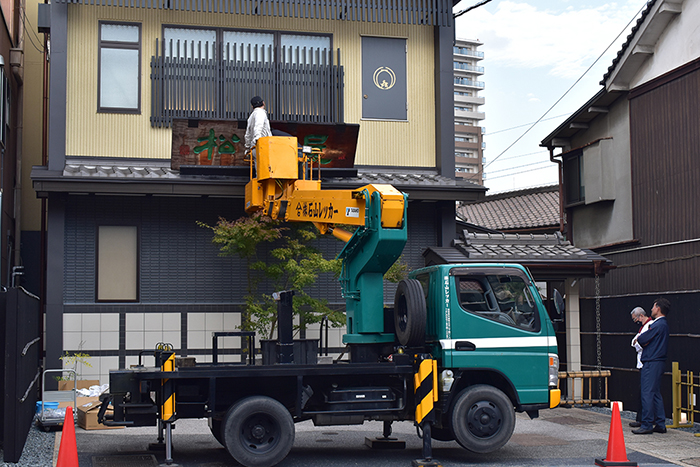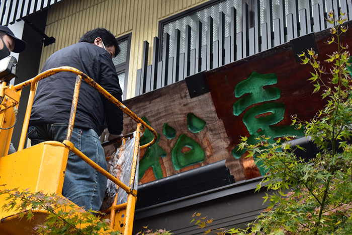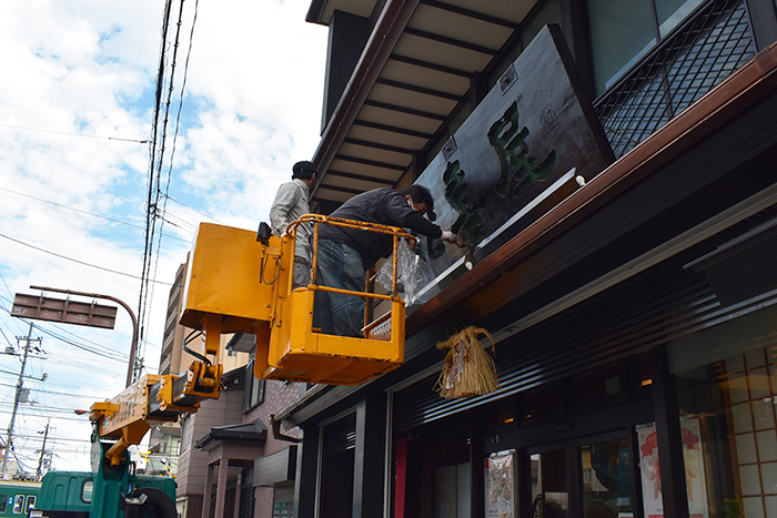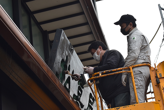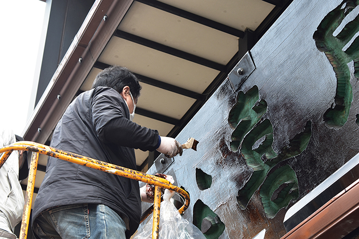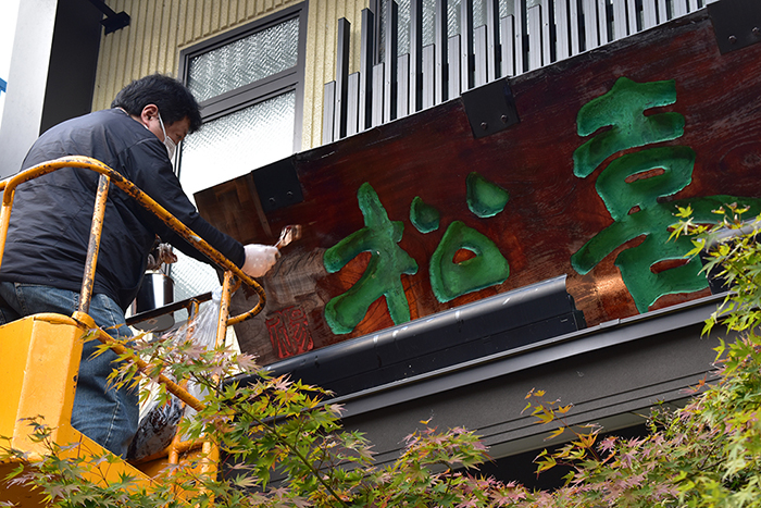 本漆を何重にも塗り重ねて仕上げた扁額ですが、風雨と紫外線により劣化していきます。そのために2年に一度、本漆をさらに塗り重ねる修復を行います。修復には、扁額の作者である漆芸家の「夏目陽介」先生に木曽から来ていただき、先生直々に高所作業車の上から塗り重ねていただきます。重厚な漆の光沢を取り戻した扁額が皆様をお迎えさせていただきます。
