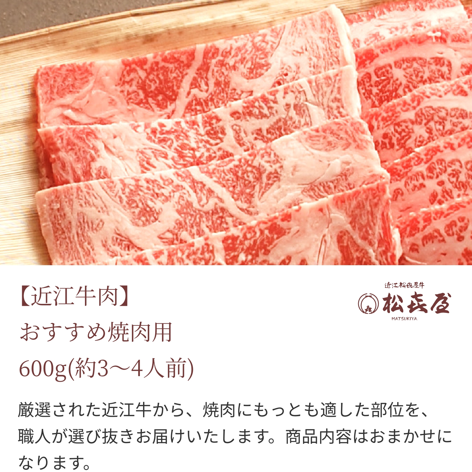 600g(3〜4人前)/厳選された近江牛から、焼肉にもっとも適した部位を、職人が選び抜きお届けいたします。
