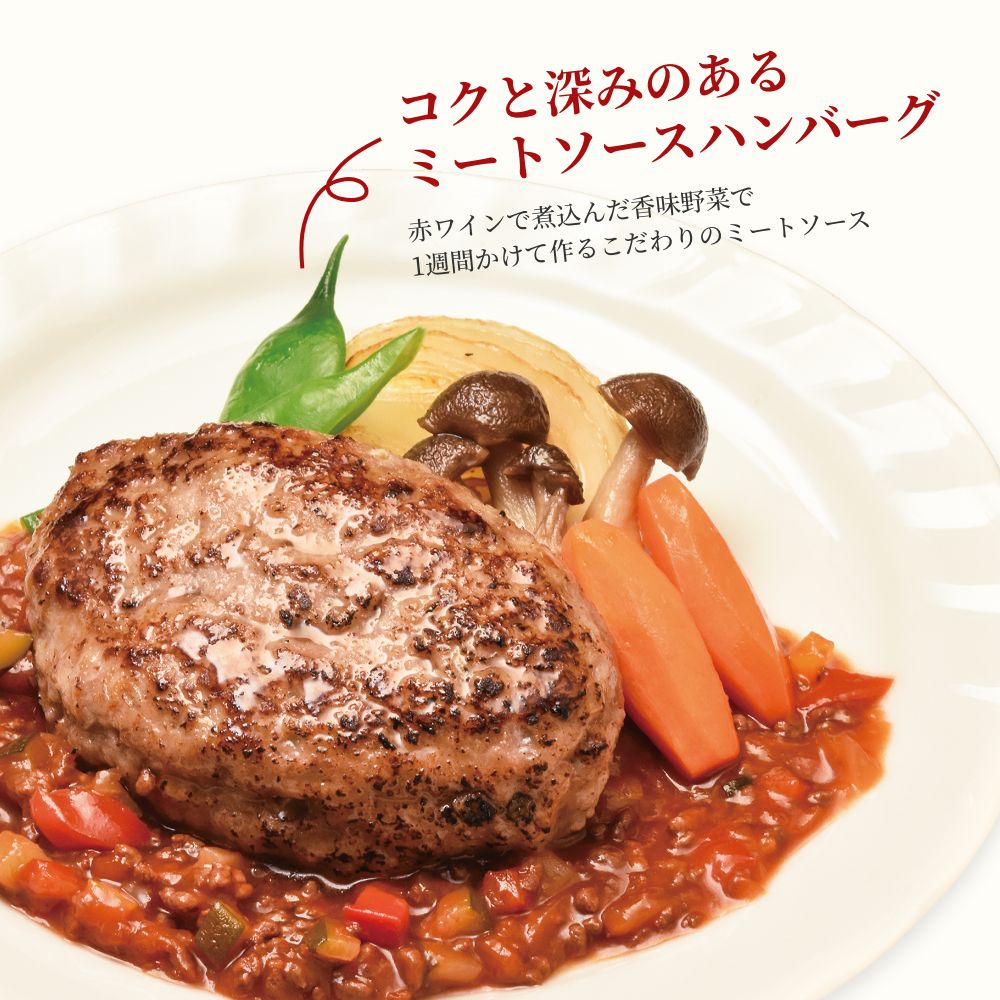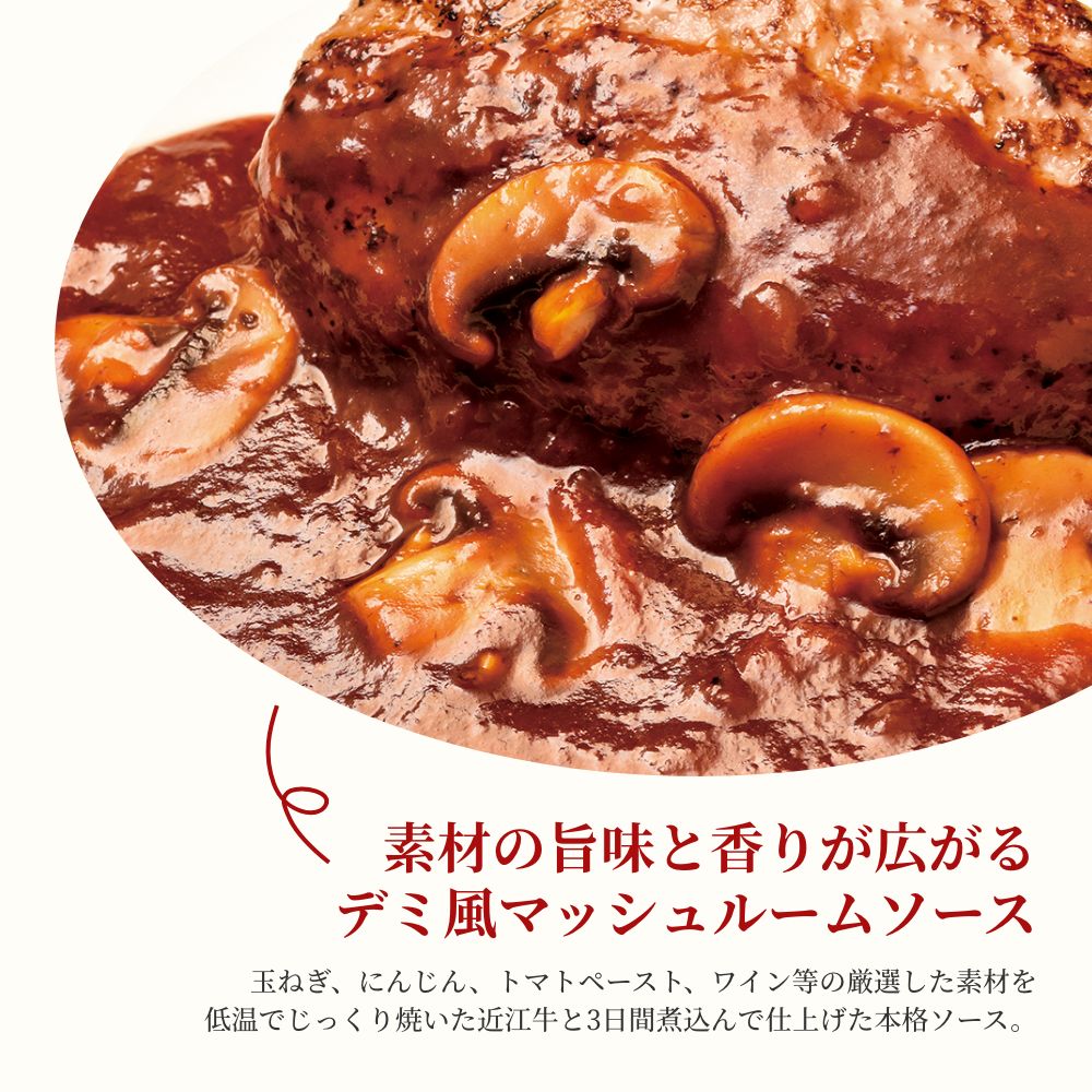 牛肉(滋賀県産)、豚肉、たまねぎ、パン粉、牛乳、酒、卵、塩、ナツメグ、ブラックペッパー、トマトペースト、トマトピューレ、中力粉、醤油、にんにく、トマト、マッシュルーム、バター、エストドラゴン酢漬け、コーンスターチ、砂糖、塩/調味料(アミノ酸等)